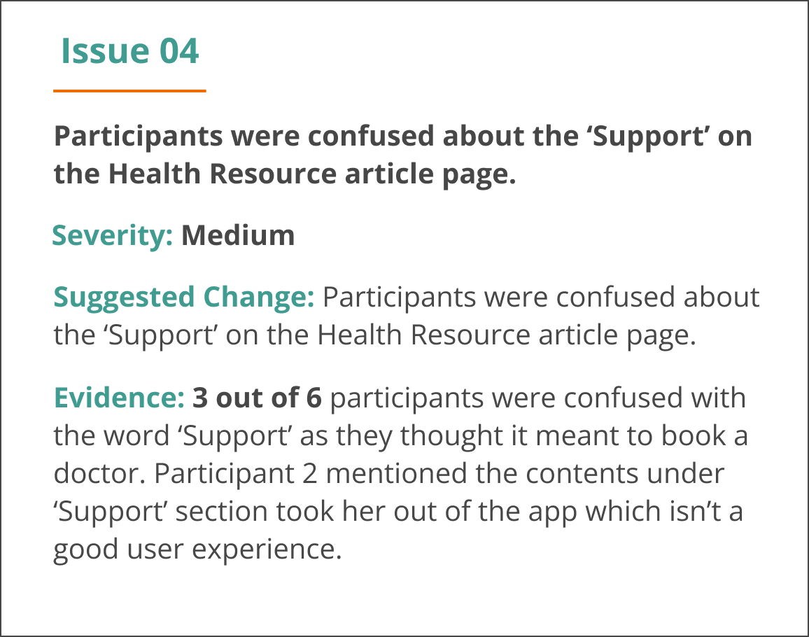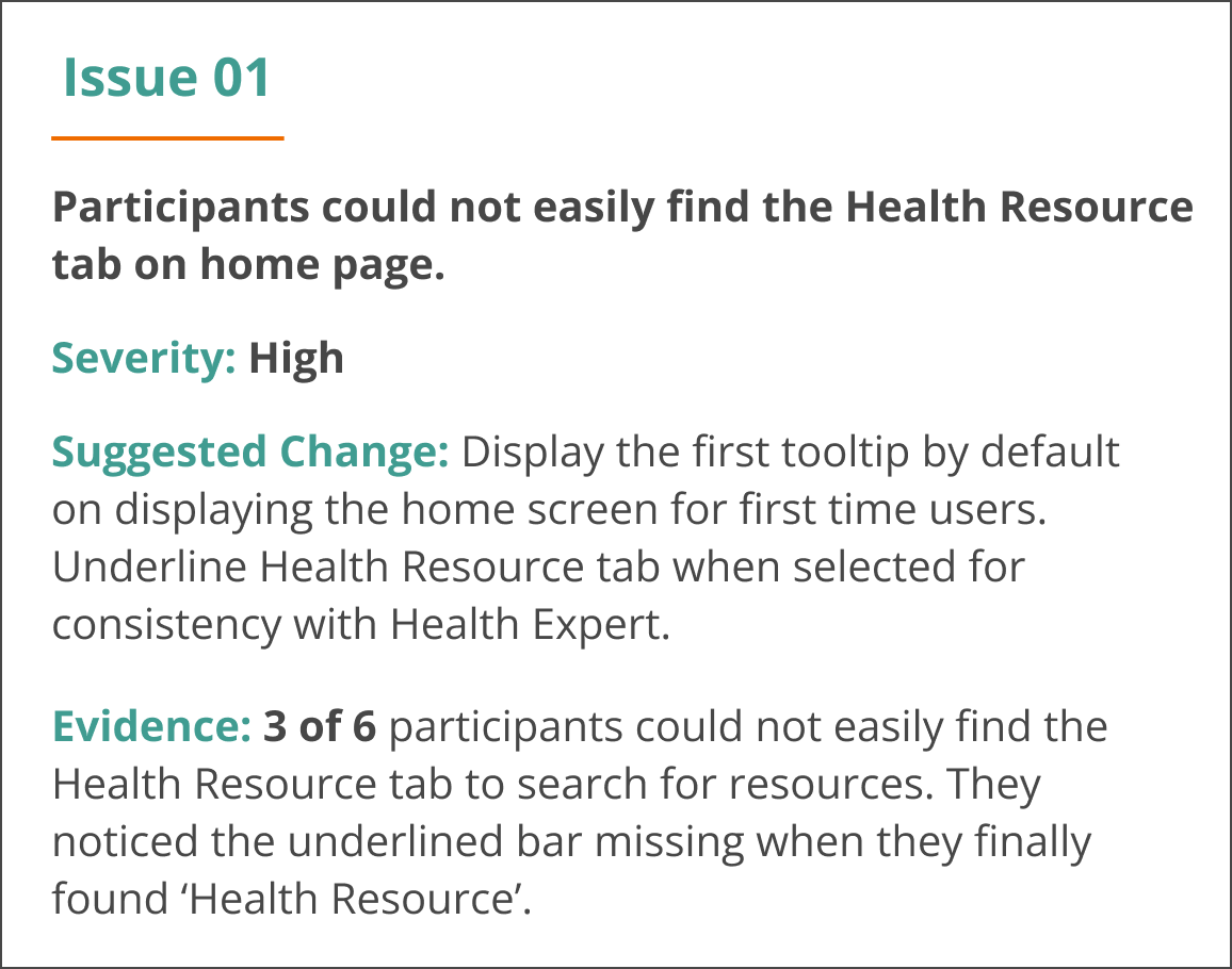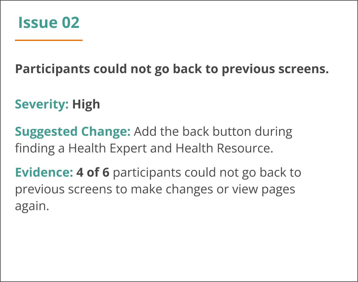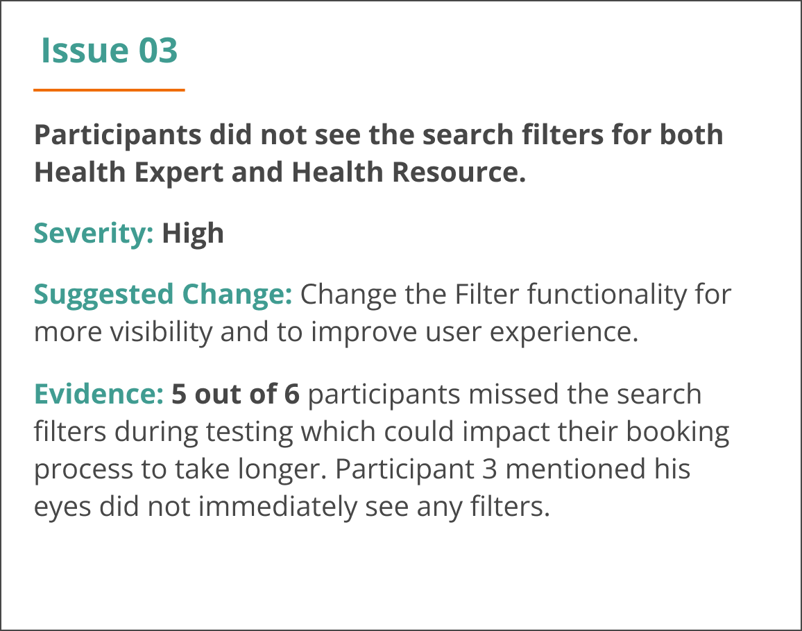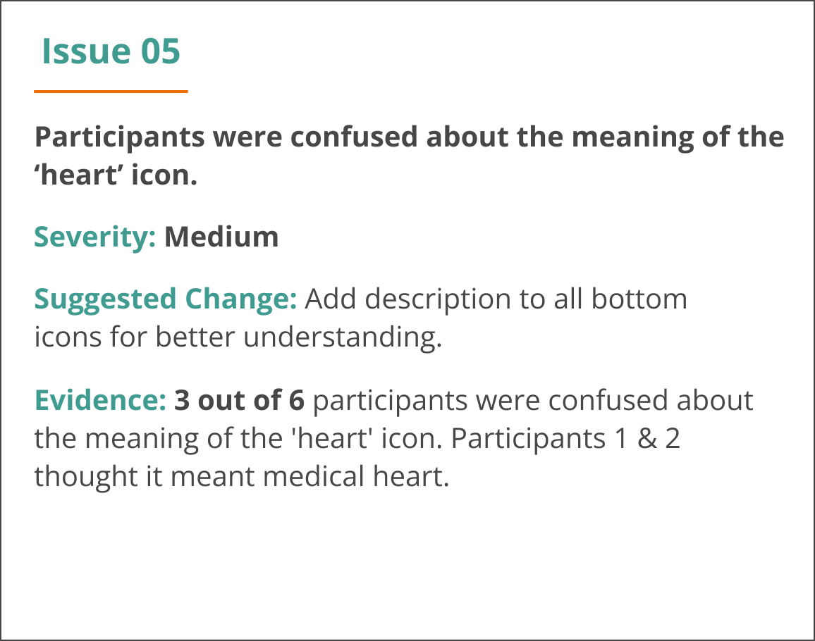 Below are the top five priorities issues found after the first round of user testing (based on Jakob Nielsen’s severity ratings).