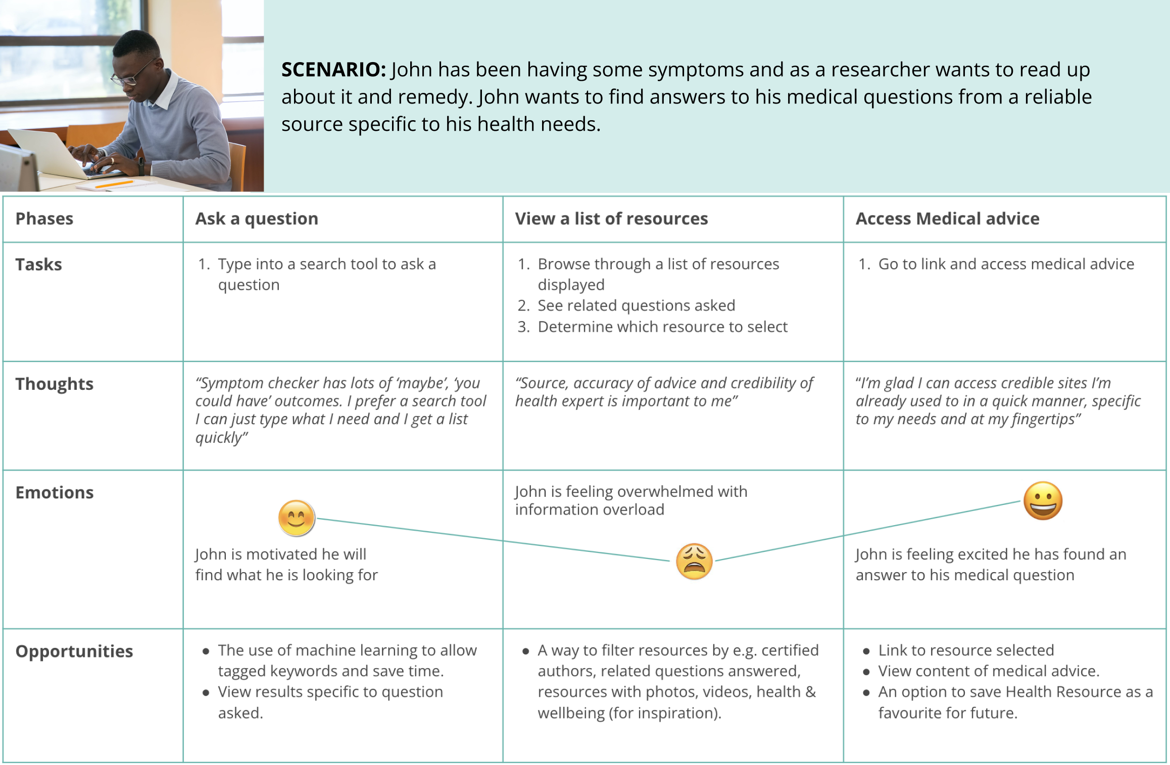 To better understand Jane and John’s thought process and emotions I created journey maps with a task analysis. This also helped to identify points of friction and opportunities.