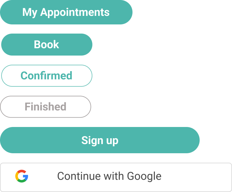 Buttons can be either filled or outlined. Regardless of width, corners are always rounded and texts are centred.